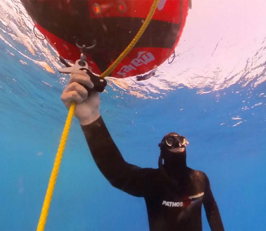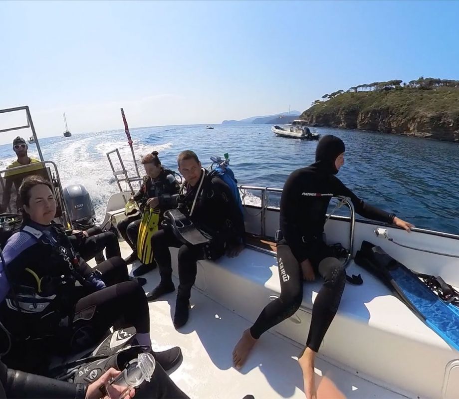 Bereits beim ersten Telefonat wurde mir klar, dass die Tauchschule unter deutscher Leitung steht. Die Organisation und Buchung verliefen entsprechend reibungslos und schnell. Nur zwei Tage später konnte ich mit einem Boot, auf dem sich vier Scuba-Taucher und mein Tauchbuddy Leo befanden, zu der etwa 10 Bootsminuten entfernten Insel Corbelli aufbrechen. Leo, ein junger und leidenschaftlicher Tauchlehrer, der sowohl Scuba- als auch Freitauchkurse anbietet, ist erst seit Mai auf Elba und begeistert von der Insel. Während die Tauchgruppe die Insel erkundete, hatte ich das Vergnügen, ein privates Coaching mit Leo am Seil zu absolvieren.