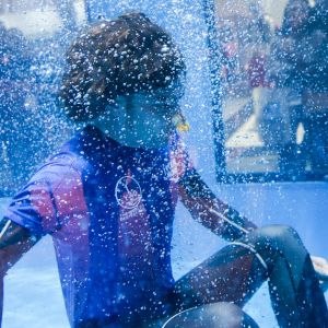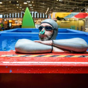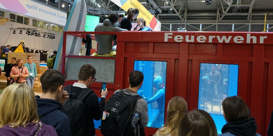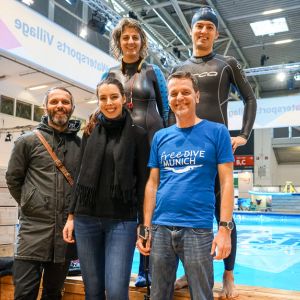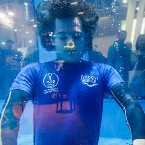 In diesem Jahr waren gleich 5 Vereinsmitglieder am Start und diesmal standen uns gleich zwei Wasserbecken zur Verfügung. Ein tieferer Tauchcontainer der Münchner Feuerwehr und ein längerer Pool. So standen die Besucher der ISPO München am Vormittag staunend vor dem verglasten „Fischtank“, in welchem wir eine recht fotogene Show-Version der Disziplin Statik zeigten. Damit es für alle was zu sehen gab, statten sich unsere Taucher – Marion, Dominik und Robert W. – hierfür mit reichlich Blei aus. Ähnlich, wie es schon Harry Houdini vor über 100 Jahren vorgemacht hat, sanken unsere drei bleibeschwerten Akteure dann auch mühelos auf den Boden des Tanks. Währenddessen wurde Robert Woltmann von einem sympatischen Messe-Moderator zu den Besonderheiten des Apnoetauchens befragt. Parallel dazu lief auf einem großen Bildschirm über dem Pool ein von Robert Klosko geschnittener Image-Film, der den Messebesuchern einen schönen Einblick in die Aktivitäten unseres Vereins bot.
