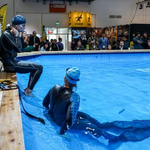 Am Nachmittag lief dann der zweiten Teil unserer "Fascination Apnea Show“. Dieser fand im 18m langen Show-Pool der ISPO statt, der diesmal leider kürzer und flacher war als 2017 und zudem schräge Wände hatte. Dennoch demonstrierte zunächst Marion Glas ausgiebig das Streckentauchen mit Flossen. Nach seinem zweiten Interview tauchte Robert Woltmann noch zum Abschluss 6 Längen DNF.