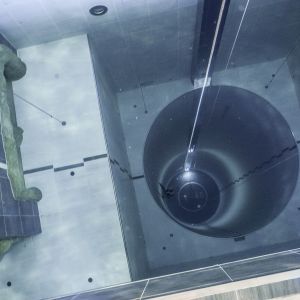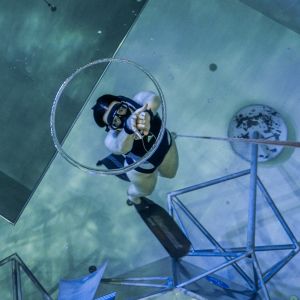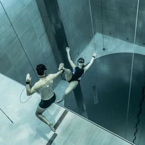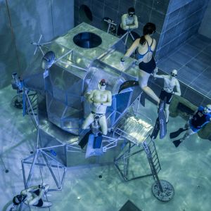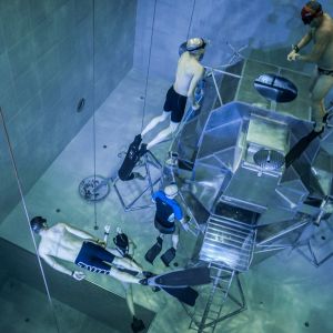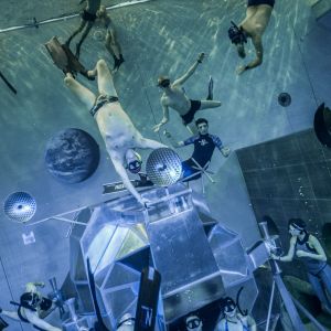 Naja, das war dann aber auch die einzige Überraschung für mich. Und sobald man im Wasser ist, ist man ohnehin in einer anderen Welt. Dafür sorgt nicht nur die spektakuläre Tiefe und Weite des Pools, sondern auch die vor kurzem dort installierte Mondkapsel, die unter dem Motto „Dive me to the Moon“ ein außergewöhnliches Ambiente erzeugt. Wir haben die Kapsel dann natürlich auch für das obligatorische Gruppenfoto genutzt.