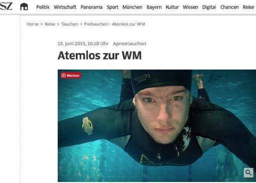 Beitrag der Süddeutschen Zeitung (Autorin: Nina Himmer) vom 19. Juni 2015 über den Freitaucher Robert Woltmann kurz vor dessen Teilnahme an seiner ersten Weltmeisterschaft im Apnoetauchen. Den vollst…