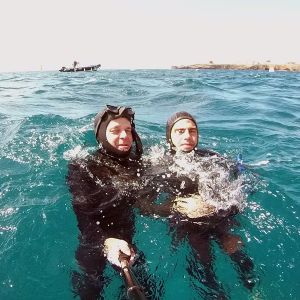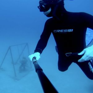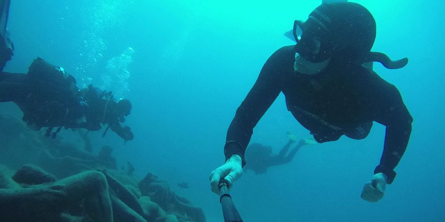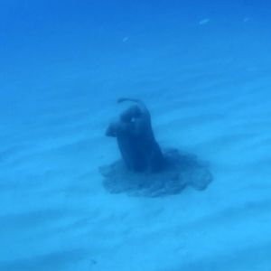 Mein ursprünglicher Tauchguide ist wegen einer Verletzung kurzfristig ausgefallen. Ich wurde am Hotel vom Stevie persönlich abgeholt, der spontan einen anderen Apnoespezialisten organisieren konnte. Eingesprungen ist der Argentinier Rodrigo, der mich im Unterwassermuseum ca. 1 Stunde begleitet und gesichert hat. Am Tauchtag schien die Sonne und Kalima (der Sandwind aus Afrika) war seit einigen Tagen vorbei. Somit konnten wir einige Tauchgänge mit sehr guter Sicht absolvieren.