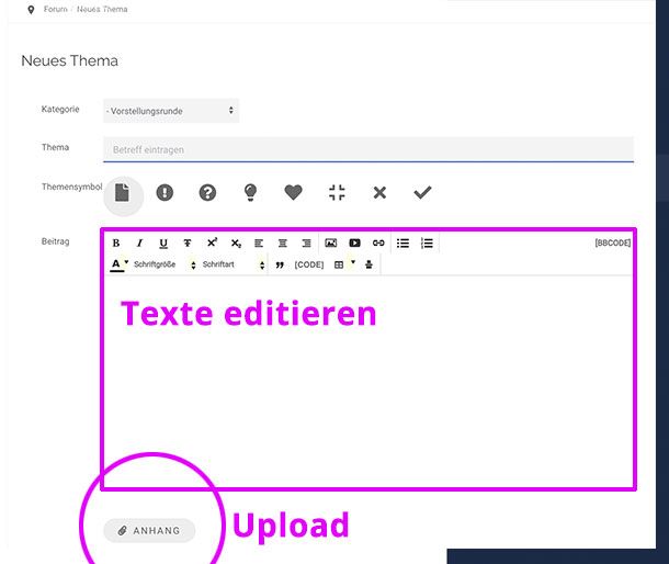 Für einen neuen Beitrag klickt man auf „Neues Thema“ (Button oben im Forum oder Menulink im Forum-Menu). Der Beitragseditor verfügt über eine Upload-Funktion (Button "Anhang"). Mit Hilfe des Uploaders könnt Ihr beispielsweise Fotos von euerem Equipment für den Marktplatz hoch laden.