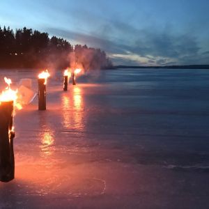 Der zweite Tauchtag, begann mit Freizeitaktivitäten. Einige Gäste ließen es sich gut gehen, die anderen entschieden sich an einer Schneemobil-Safari teilzunehmen, die vom Ferienort Lehmokärki organisiert wurde. Dort bafand sich auch die Unterkunft für die gesamte Veranstaltung. Von dieser Reise kamen viele lächelnde Gesichter zurück. Am Abend fand der Nachttauchgang statt. Die Finnische Dunkelheit kommt relativ spät und noch vor der totalen Dunkelheit gab es blaue Momente und Dämmerung. Brennendes Holz, starke Lichter für die Fotografen und kleinere bewegliche Lichter der Taucher bildeten eine schöne Kulisse und sorgten für eine gemütliche Atmosphäre auf dem Eis.