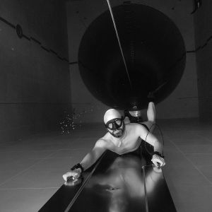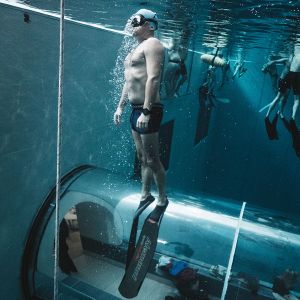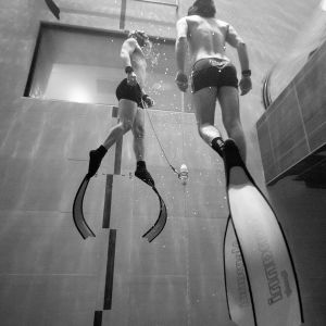 Nach mehreren anfänglichen unbedachtem Auf und Ab, ich war wohl im Geiste zu sehr in der kindlichen Badewanne, werde ich von Matthias freundlich daran erinnert, doch immer meinem Buddy zu sagen, was ich vorhabe. Das hatte ich wohl in der Begeisterung vergessen. Und wenn dann 30 Taucher mit einem im Becken sind, kommt man sich wahrlich auch nicht alleine vor. Aber er hat natürlich recht. Safety first and never dive alone. Und so übte jeder in kleinen Gruppen diejenigen Skills, die ihm wichtig waren: Moritz und Felix lernten von Matthias erstmal die Grundlagen des Tieftauchens, ich versuchte mich zum ersten Mal an "No Fins“. Und wieder andere machten sich gleich auf, um die -42m zu erreichen. Mal im Free Immersion, mal CWT mit BiFins, mal mit Mono. Morgan machte währenddessen immer wieder Fotos.