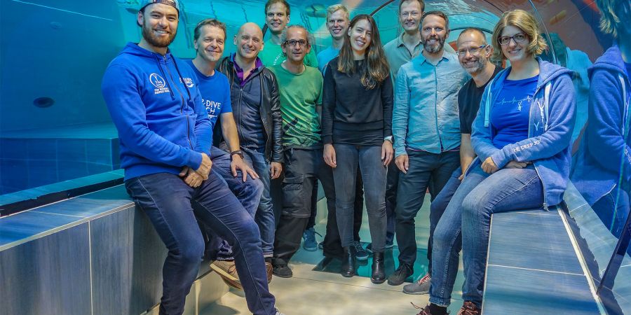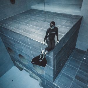 Das Wasser geht mir bis zur Brust, während ich im flachen Bereich darauf wartete, endlich in den tieferen Bereich zu kommen. Die Organisation im Y-40 ist sehr streng. Man darf erst eine halbe Stunde vor der Tauchzeit in den Umkleidebereich und auch erst 15 Minuten vorher in das Becken. Wiederholt wechselt mein Blick zwischen der Uhr und der Unterwasserabsperrrung, die mich symbolisch vom tieferen Bereich trennte. Noch kann ich die 42m tiefe Röhre nicht sehen, da ich am falschen Ende des Beckens stehe. Aber das ist auch gar nicht nötig. Auch so scheint mich der Boden in 10m Tiefe magisch anzuziehen.